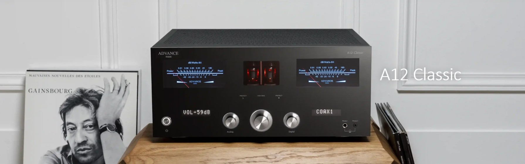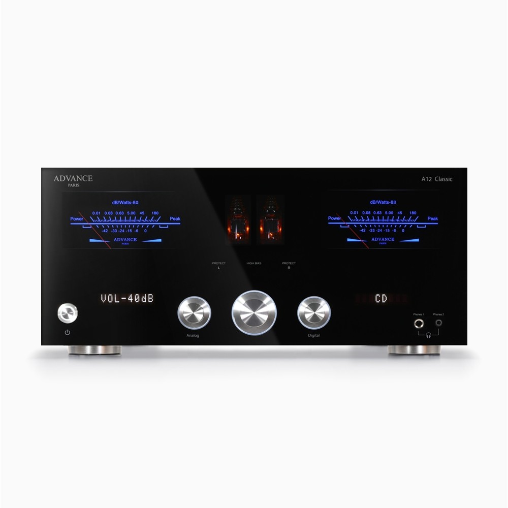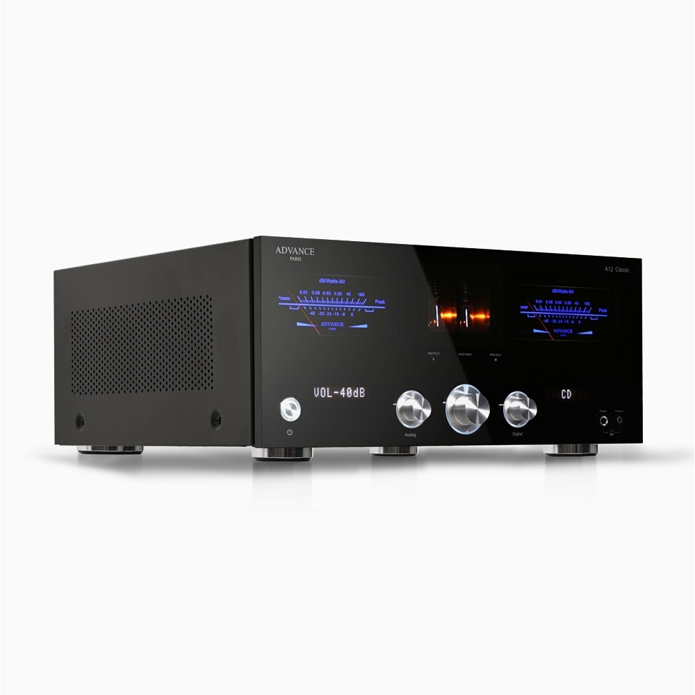 Το Advance Paris A12 Classic είναι ένας ισχυρός στερεοφωνικός ενισχυτής (190 W/κανάλι) σε διπλή μονοφωνική λειτουργία, που προσφέρει πληθώρα συνδέσεων: HDMI, USB, Phono MM/MC, RCA, AES-EBU, οπτικές, ομοαξονικές, εξόδους XLR/RCA και διπλό περίβλημα. Οι λυχνίες προενισχυτή του εξασφαλίζουν ζεστό ήχο, ενώ το Bluetooth (προαιρετικό) συμπληρώνει την audiophile απόδοσή του.