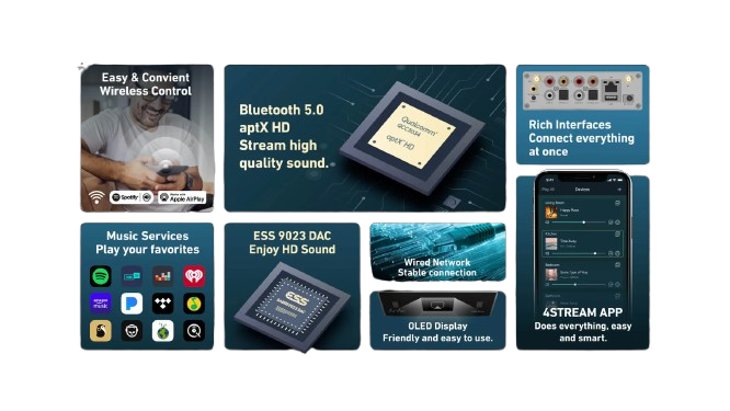 - AirPlay, DLNA, UPnP, Spotify Connect, Qplay