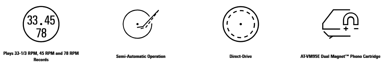- Ημι-αυτόματο πικάπ άμεσης μετάδοσης κίνησης (direct-drive) με τρεις ταχύτητες: 33-1/3, 45,