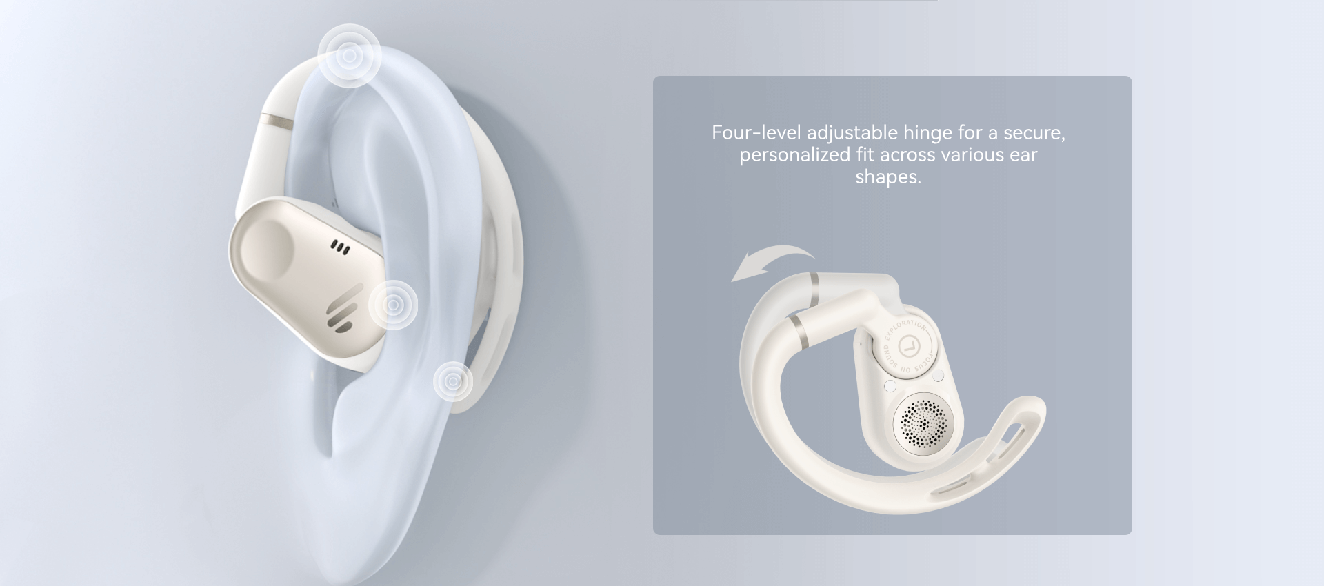 - Ο σχεδιασμός ανοικτού αυτιού με περιστρεφόμενα άγκιστρα εξασφαλίζει ασφαλή, προσαρμόσιμη εφαρμογή για άνεση όλη την ημέρα.