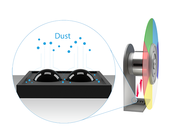 Incorporating color wheel sensors with an ingenious anti-dust accumulation feature, MX808STH prolongs optimal performance by rejecting dust which can accumulate on traditional sensors to block the IR signal and cause flickering, abnormal colors, or even shutdown.