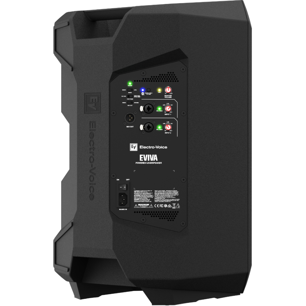 - Αυτοενισχυόμενο ηχείο 2 δρόμων σε πλαστική καμπίνα με woofer 12" και κόρνα 1", ενισχυτής 1000W RMS class D με limiter (διασπορά 90 Χ 60), απόκριση συχνότητας 50-20000Hz, 125dB max SPL . Διαθέτει σύνδεση BLUETOOTH για Streaming. Παρέχονται 2 είσοδοι μίξης με Line Balanced XLR combo/ jack με ενδεικτικό LED εισόδου (Signal, Peak). Link out με Balanced XLR με επιλογή Mono/Stereo για το BT streaming. Επιλογή λειτουργίας 2 θέσεων με διακόπτη (Music, Live), ρύθμιση high pass 2 θέσεων με διακόπτη ( No Sub, EVIVA18SP). Master out Volume με ενδεικτικό Limit. Bάρος 12kg σε μαύρο χρώμα. Διαθέτει φωλιά για βάση στήριξης.