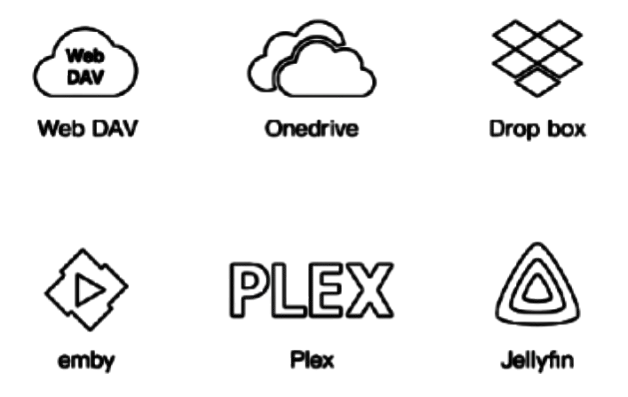 - WebDAV, UPnP, NFS, SMB, Onedrive, Drop box, emby, Plex...