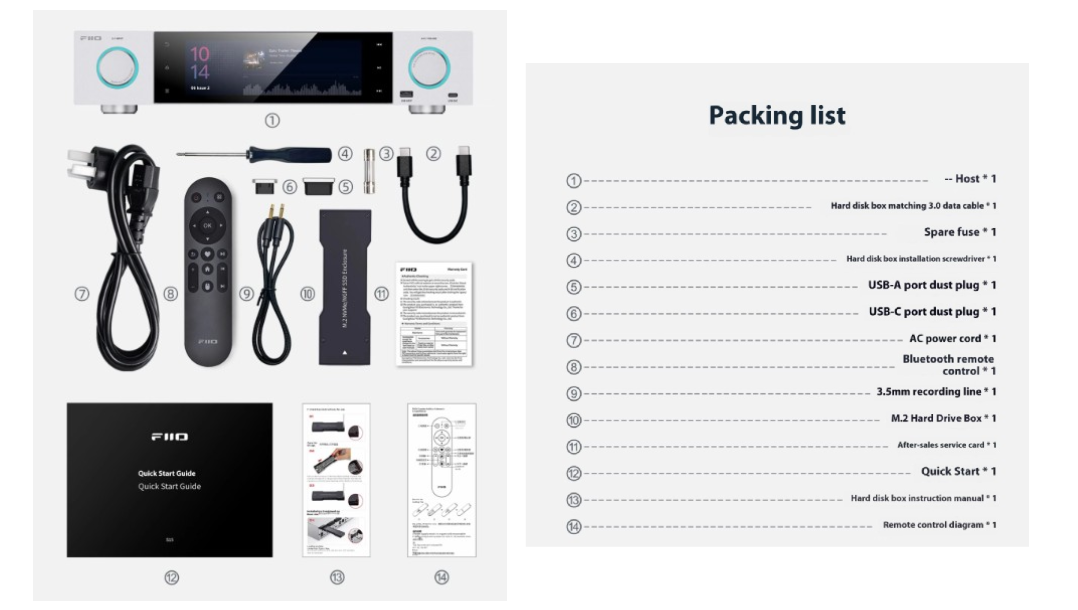 What’s in the Box: 1x S15, 1x Screwdriver for installing the hard disk cage, 1x Spare Fuse, 1x Power Cable, 1x Bluetooth Remote Control, 1x Hard Disk Cage Data Cable (USB 3.0), 1x M.2 Hard Disk Cage, Warranty Card, Quick Start Guide, Operating Instructions for the Hard Disk Cage, Remote Control Diagram, 1x USB-A Dust Plug, 1x USB-C Dust Plug, 1x 3.5 mm Audio Cable