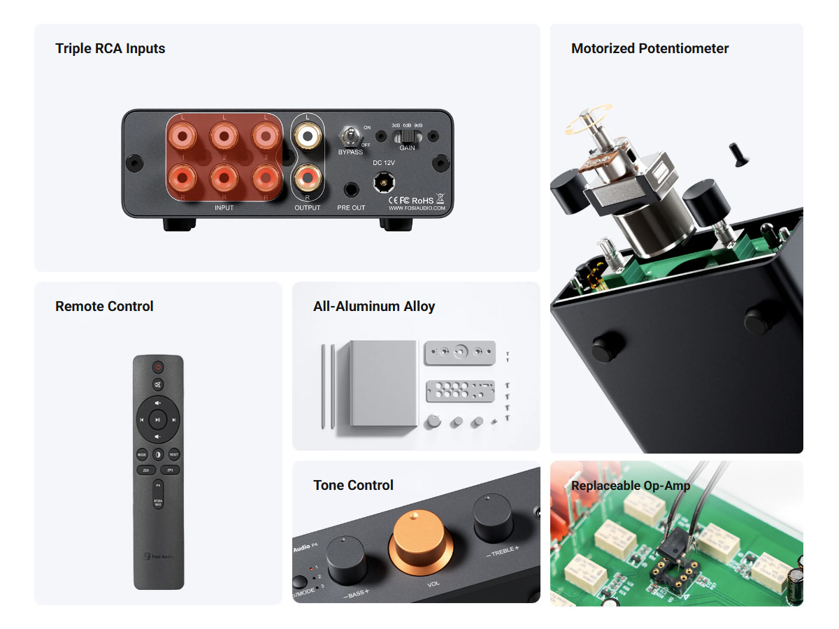 Το P4 είναι μια συμπαγής και ευέλικτη λύση. Με τις τρεις στερεοφωνικές εισόδους RCA, τον έλεγχο έντασης με μοτέρ ποτενσιόμετρο, τον έλεγχο τόνου, την επιλογή κέρδους και τον κομψό σχεδιασμό, προσφέρει μια υψηλής ποιότητας ηχητική εμπειρία.