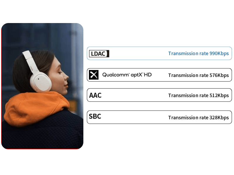 The W820NB Plus features LDAC high definition codecs technology, with the transmission bandwidth up to 990kbps, like the highway in wireless protocol. The high bit-rate audio files are greatly protected during wireless transmission, with about 3 times music details retained, offering nearly lossless sound, natural and full.