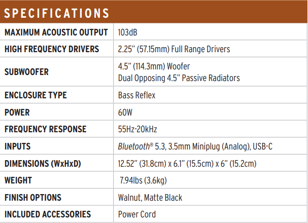 55Hz-20kHz +/- 3dB • Max output 103 dB |