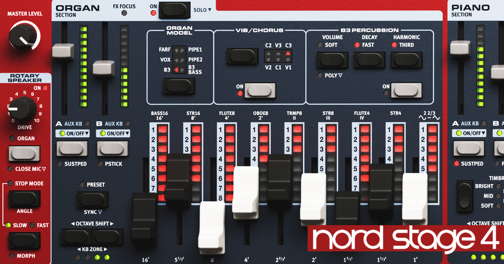 - Το τμήμα Organ περιλαμβάνει τις βραβευμένες προσομοιώσεις της Νοrd B3 Tonewheel, B3 Bass, classic Vox και Farfisa καθώς και δύο μοντέλα Pipe Organ. Eίναι εξοπλισμένο με Physical drawbars με ενδείξεις LED για βέλτιστη πρακτική εμπειρία και επισκόπηση.