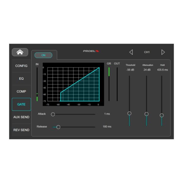 - Gate: Threshold, Attenuation, Hold, Attack, Release