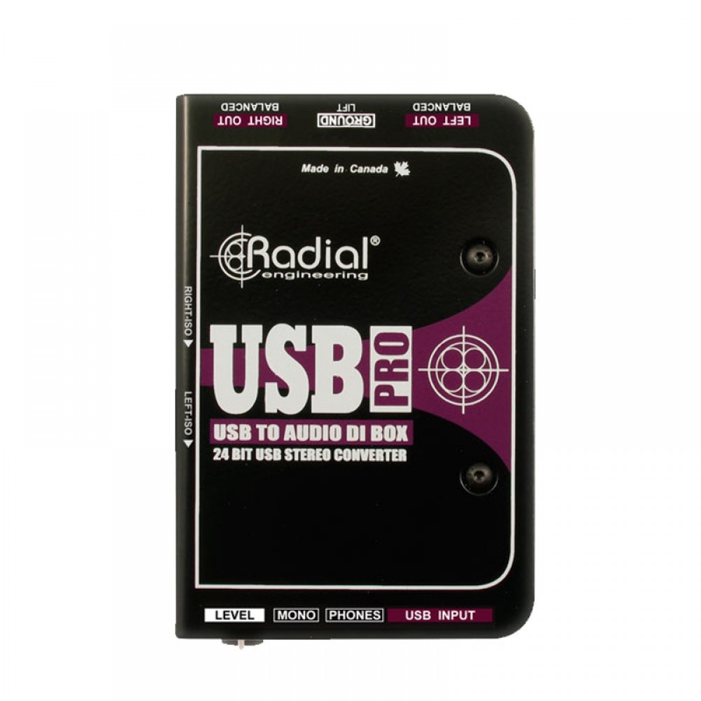Tο Radial USB-Pro είναι ένα υψηλής ανάλυσης στέρεο Di Box, σχεδιασμένο για μετατροπή αρχείων ήχου από φορητό υπολογιστή, καθώς και την απρόσκοπτη μεταφορά τους σε ζεύγος συμμετρικών εξόδων ήχου, για τροφοδότηση ΡΑ, ηχογράφηση ή για κονσόλα μείξης. Το USB-Pro ρυθμίζεται αυτόματα μόνο του για χρήση με όλα τα δημοφιλή λειτουργικά συστήματα, συμπεριλαμβανομένων των Mac OSX, Windows XP, Vista και Windows 7, εξαλείφοντας έτσι την ανάγκη εγκατάστασης ειδικών οδηγών (drivers). Σε αντίθεση με τις συσκευές που περιορίζονται στα 16 bit, 44.1kHz conversion rates, το USB-Pro ανεβάζει την απόδοση με true 24 bit, 96kHz stereo μετατροπείς, έτσι ώστε να προσφέρει περισσότερο χώρο και μεγαλύτερη λεπτομέρεια. Αυτό εξαλείφει την ανάγκη για πρόσθετες κάρτες ήχου ή ξεχωριστούς μετατροπείς κατά τη μεταφορά αρχείων.