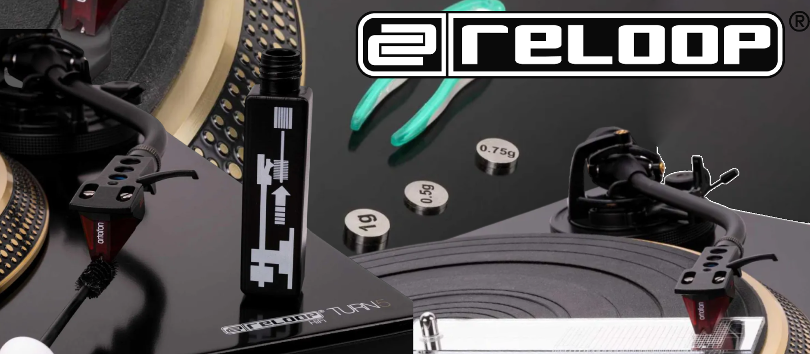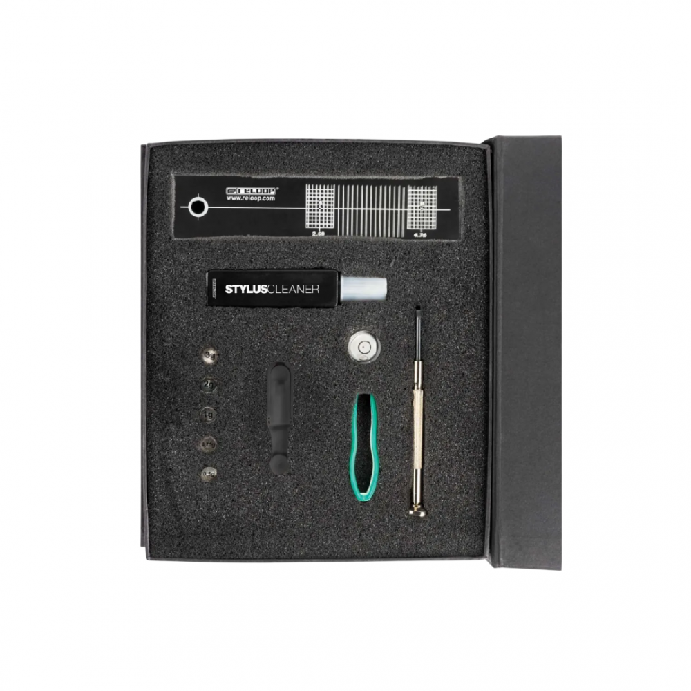 Ολοκληρωμένο σετ από την Reloop για προσαρμογή, ευθυγράμμιση και καθαρισμό του βραχίονα και της κεφαλής του πικάπ.